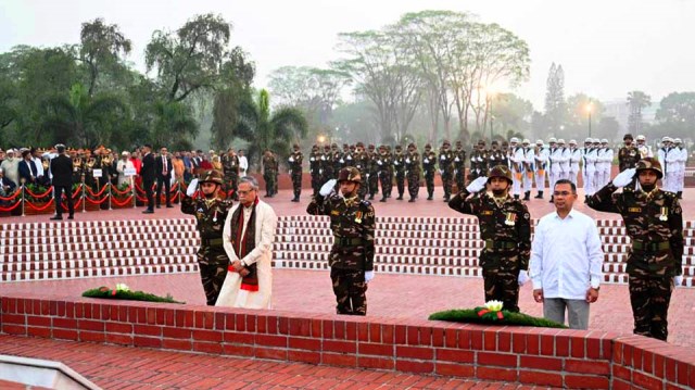 বৃহস্পতিবার ভোর ৫টা ৫৬ মিনিটে সাভারে জাতীয় স্মৃতিসৌধে ফুল দিয়ে শ্রদ্ধা জানান রাষ্ট্রপ্রধান ও সরকারপ্রধান।