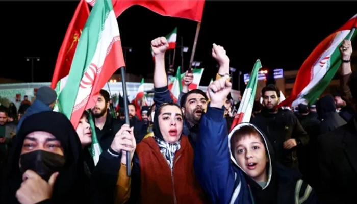 ছবিতে দেখা যাচ্ছে, ইরানি পতাকা এবং দেশটির প্রয়াত সর্বোচ্চ নেতা আয়াতুল্লাহ আলি খামেনির ছবি হাতে নিয়ে ইরানিরা রাস্তায় নেমেছেন। অনেকে স্লোগান দিচ্ছেন।